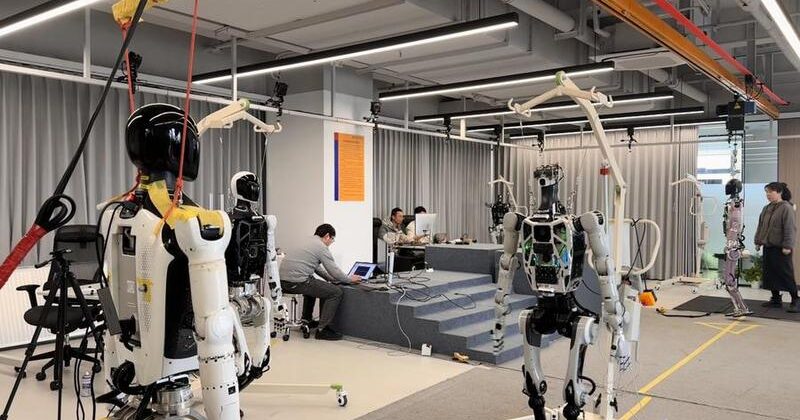 Expertos programan robots en el Centro de Innovación de Robots Humanoides de Zhejiang, en Ningbo, ciudad de la provincia oriental china de Zhejiang, el 19 de febrero de 2025. (Xinhua/Zheng Keyi)
