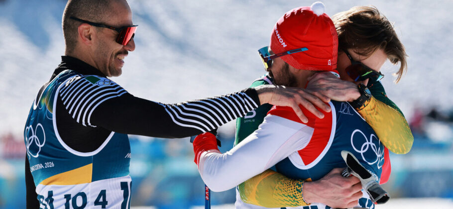 Allan Corona llega a la meta en los Juegos Olímpicos de Invierno 2026 y celebra con sus compañeros