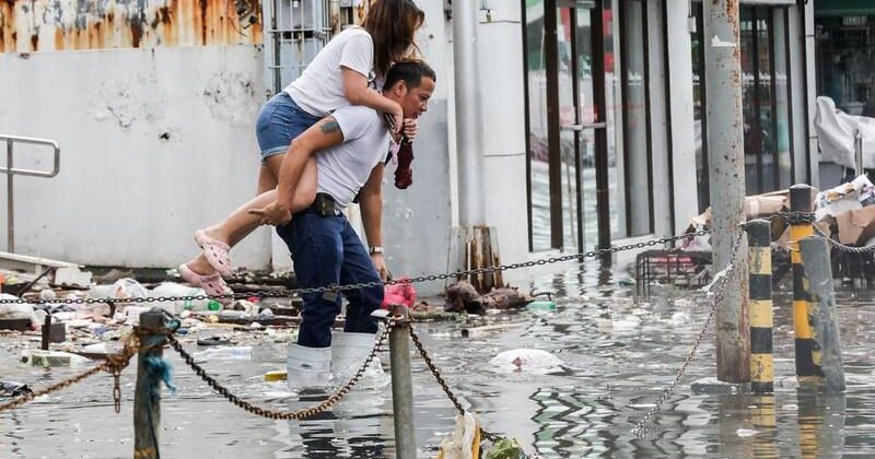 Un hombre carga a una mujer en su espalda mientras vadea a través de agua de inundación, en la Ciudad de Navotas, Filipinas, el 10 de noviembre de 2025. (Xinhua/Rouelle Umali)