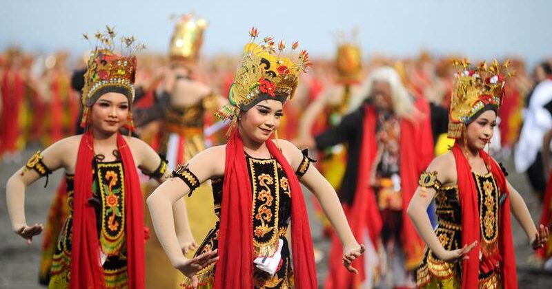 BANYUWANGI, Indonesia, Oct. 27 (Xinhua) — Performers in traditional costumes staged Gandrung, a popular mass dance in Banyuwangi, East Java, Indonesia, on Saturday to celebrate the Gandrung Sewu Festival.