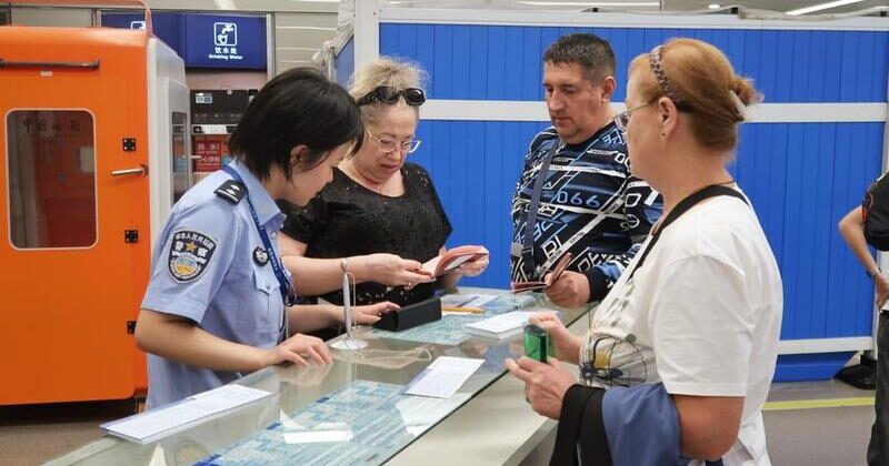 Una funcionaria de inmigración ayuda a viajeros rusos a completar sus tarjetas de llegada en Shanghai, en el este de China, el 15 de septiembre de 2025. (Xinhua/Tang Siqi)