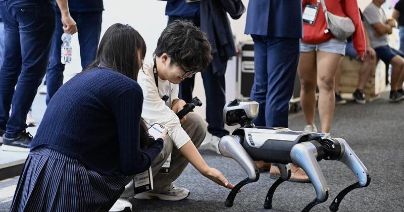 Imagen del 5 de septiembre de 2025 de personas interactuando con un perro robot en la IFA Berlín 2025, en Berlín, Alemania. (Xinhua/Zhang Haofu)