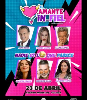 La comedia teatral “El amante infiel” se presentará por única ocasión en el Teatro Morelos de Toluca el próximo jueves 23 de abril, con una función programada a las 8 de la noche, en un montaje encabezado por Juan Soler, Ingrid Martz y Alexis Ayala, quien además participa como productor asociado y director. Los boletos ya se encuentran disponibles a través del sistema Arema.mx, para una función que promete convertirse en uno de los encuentros teatrales más destacados de la temporada en la capital mexiquense.