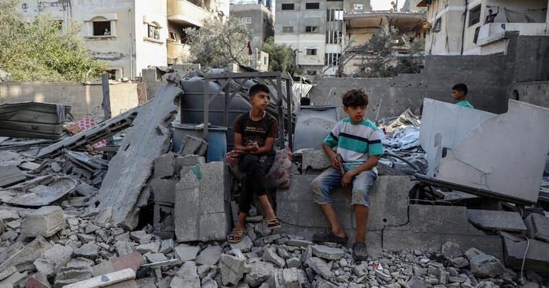 Niños palestinos se sientan entre la destrucción masiva causada por un ataque aéreo israelí, en el área de Al-Zawaida, en el centro de la Franja de Gaza, el 25 de septiembre de 2025. (Xinhua/Rizek Abdeljawad)