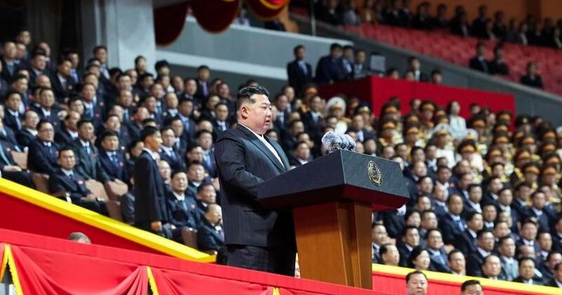 Imagen del 9 de octubre de 2025 de Kim Jong Un, secretario general del Partido de los Trabajadores de Corea (PTC) y presidente de Asuntos de Estado de la República Popular Democrática de Corea (RPDC), pronunciando un discurso en un gran encuentro conmemorativo para celebrar el 80º aniversario de la fundación del PTC, en el estadio Día de Mayo, en Pyongyang, RPDC. (Xinhua/Huang Jingwen)