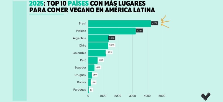 Brasil encabeza el ranking con 4.259 lugares con opciones veganas, seguido por México con 3.224 y Argentina con 1.402. Chile y Colombia completan el top cinco.