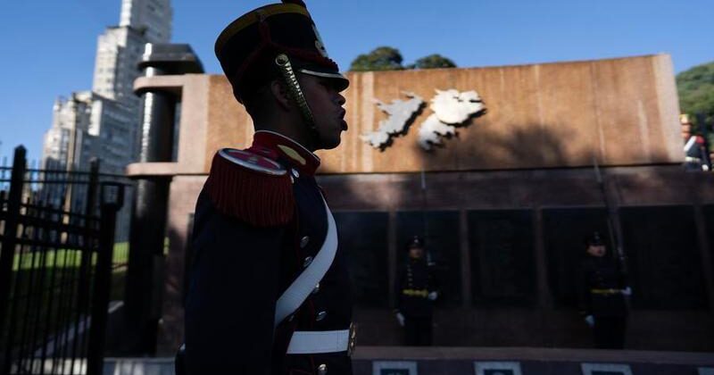Un miembro del Regimiento de Granaderos a Caballo custodia el cenotafio durante un acto realizado frente al Monumento a los Caídos en Malvinas, al cumplirse 43 años del inicio de un conflicto bélico entre Argentina y el Reino Unido, en la ciudad de Buenos Aires, Argentina, el 2 de abril de 2025. (Xinhua/Martín Zabala)