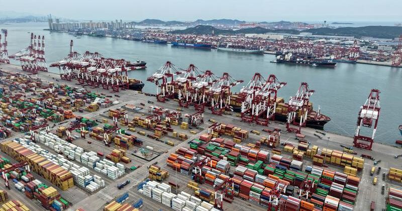 Vista aérea tomada con un dron el 26 de agosto de 2025 del puerto de Qingdao, en la provincia de Shandong, en el este de China. (Xinhua/Li Ziheng)