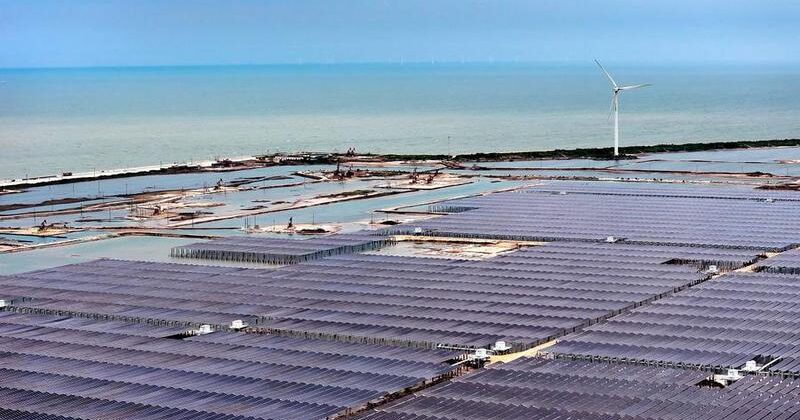 Vista aérea fotografiada con un dron mostrando un proyecto de demostración para la integración de energía fotovoltaica y almacenamiento de energía en la ciudad de Dongying, provincia de Shandong, en el este de China, el 8 de agosto de 2025. (Xinhua/Guo Xulei).