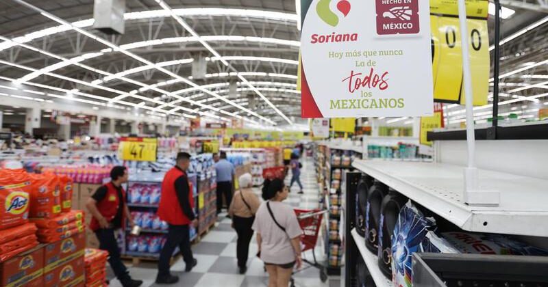 Personas recorren un pasillo con productos marcados con el sello "Hecho en México", en un supermercado de la Ciudad de México, la capital mexicana, el 7 de marzo de 2025. (Xinhua/Francisco Cañedo)