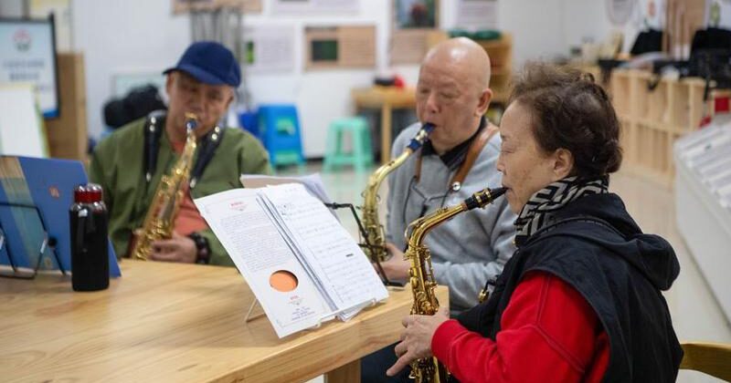 Ancianos ensayan con instrumentos musicales en un centro de actividades comunitarias para personas mayores en el distrito de Jiangbei, municipalidad de Chongqing, en el suroeste de China, el 29 de octubre de 2025. (Xinhua/Tang Yi)