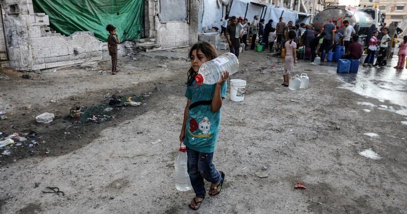 Imagen del 25 de agosto de 2025 de una niña palestina desplazada recolectando agua en un refugio temporal, en el noroeste de la Ciudad de Gaza. (Xinhua/Rizek Abdeljawad)