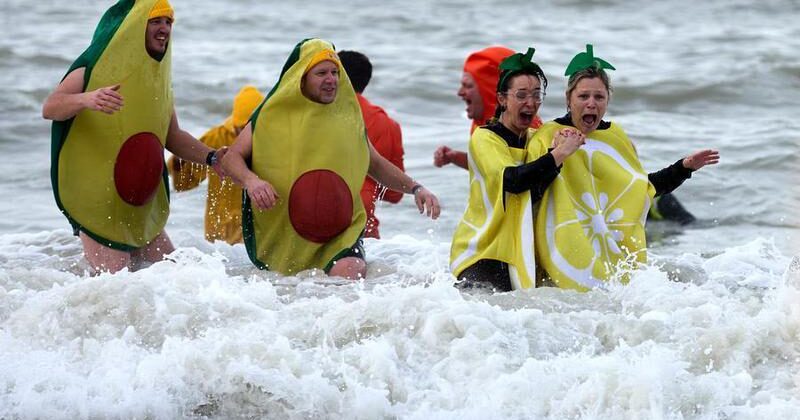 Imagen del 4 de enero de 2025 de personas participando en la Zambullida de Año Nuevo 2025 en el mar del Norte, en Ostend, Bélgica. (Xinhua/Meng Dingbo)
