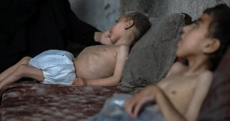 Imagen del 25 de julio de 2025 de dos niños palestinos desplazados que sufren desnutrición y parálisis cerebral vistos dentro de una escuela convertida en refugio, en el noroeste de la Ciudad de Gaza. (Xinhua/Rizek Abdeljawad)