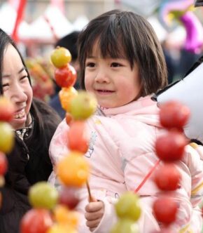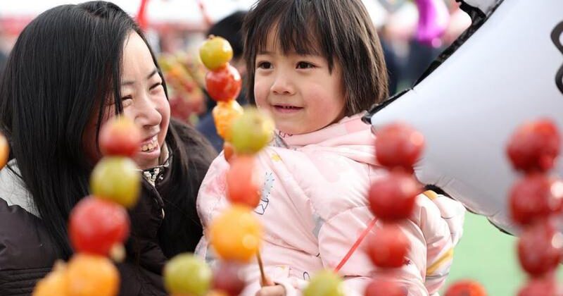 Una niña elige un tanghulu, un bocadillo tradicional chino que consiste en espinos o frutas recubiertos de azúcar, en un mercado temático de la Fiesta de la Primavera en el distrito de Anding, en la ciudad de Dingxi, provincia de Gansu, en el noroeste de China, el 19 de enero de 2026. (Xinhua/Chen Bin)