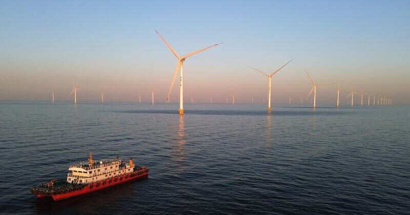Vista aérea tomada con un dron el 7 de enero de 2025 de un parque eólico marino en las aguas de la ciudad de Laizhou, en la provincia de Shandong, en el este de China. (Xinhua/Xu Suhui)