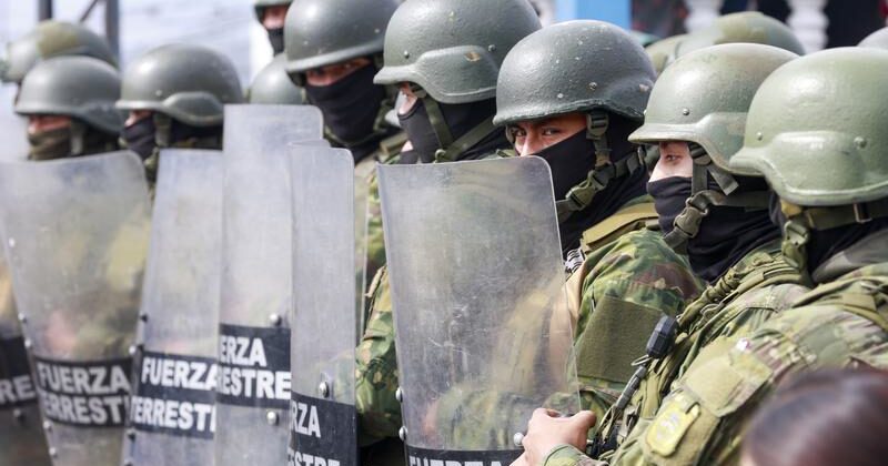 Elementos del Ejército ecuatoriano vigilan durante una protesta por la eliminación del subsidio al diésel, en Quito, capital de Ecuador, el 16 de septiembre de 2025. (Xinhua/Ricardo Landeta)