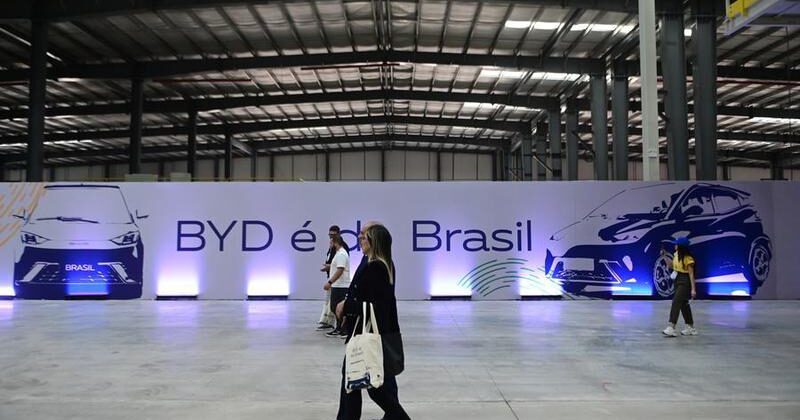 Imagen del 1 de julio de 2025 de invitados caminando frente a una pared de exhibición temática en la base de producción de BYD, en Camacari, en el estado de Bahía, Brasil. (Xinhua/Lucio Tavora)
