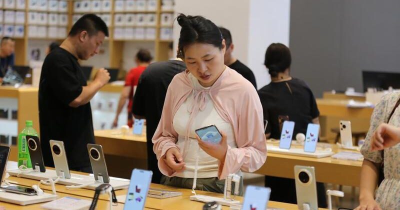 Imagen del 15 de junio de 2025 de una clienta seleccionando productos en una tienda de teléfonos celulares, en la ciudad de Leshan, en la provincia de Sichuan, en el suroeste de China. (Xinhua/Li Huashi)