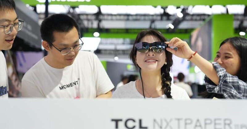 Una visitante prueba un par de gafas en el stand de TCL en el área de Cadena de Tecnología Digital de la tercera Exposición Internacional de la Cadena de Suministro de China en Beijing, capital de China, el 19 de julio de 2025. (Xinhua/Ju Huanzong)