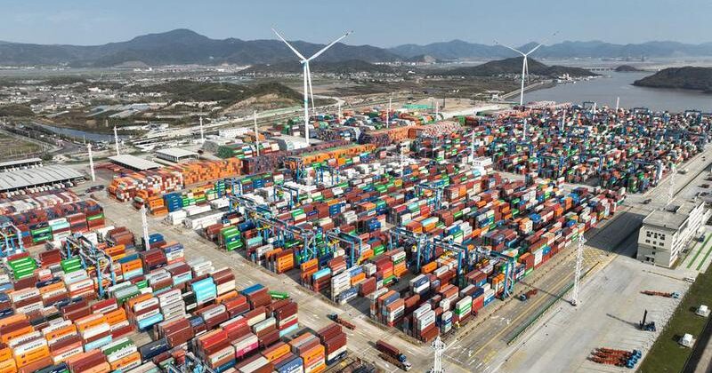 Fotografía aérea tomada con un dron muestra una vista del área portuaria de Meishan del puerto Ningbo-Zhoushan en la provincia de Zhejiang, en el este de China, el 2 de diciembre de 2025. (Xinhua/Weng Xinyang)