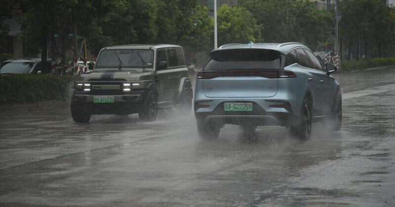 Automóviles circulan bajo la lluvia en una calle, en el poblado de Qiandong, en la ciudad de Chaozhou, en la provincia de Guangdong, en el sur de China, el 14 de agosto de 2025. (Xinhua/Hong Zehua)