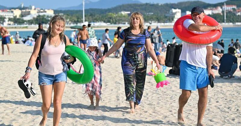 Imagen del 11 de enero de 2026 de turistas extranjeros divirtiéndose en el área escénica de Dadonghai, en Sanya, en la provincia de Hainan, en el sur de China. (Xinhua/Guo Cheng)