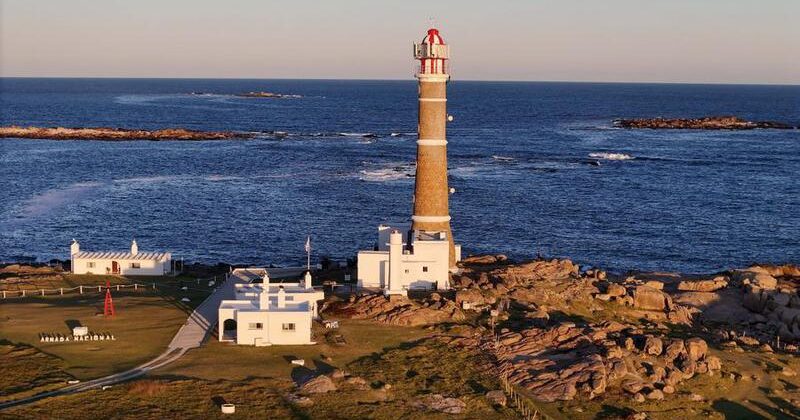 Imagen tomada con un dron el 30 de enero de 2024 del faro frente a las islas que forman parte del Cabo Polonio, donde lobos y leones marinos viven, se aparean y reproducen, en el departamento de Rocha, Uruguay. (Xinhua/Nicolás Celaya)