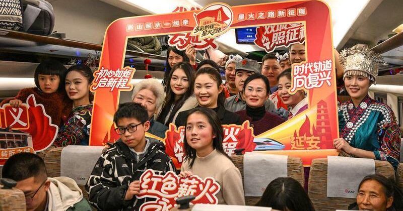 Personal ferroviario y pasajeros posan para una foto grupal en el tren de alta velocidad G3360 en la provincia de Guizhou, en el suroeste de China, el 26 de enero de 2026. (Xinhua/Yang Wenbin)
