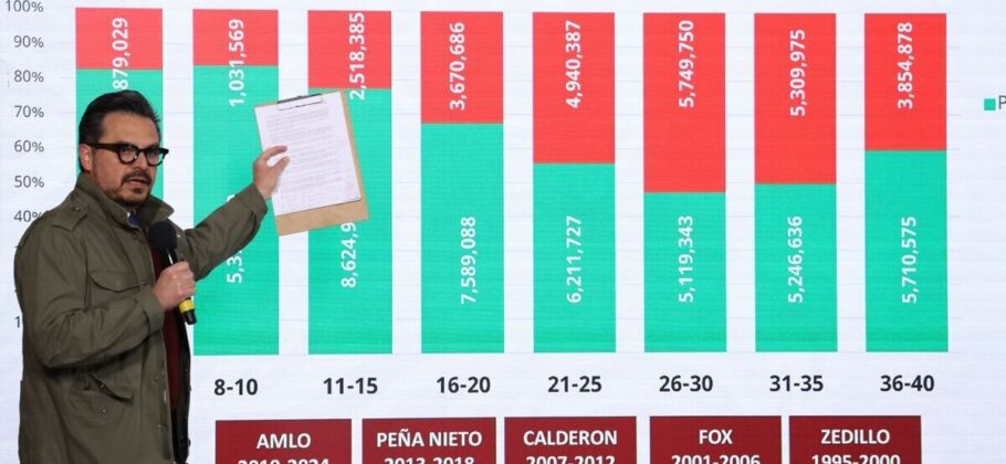 CIUDAD DE MÉXICO, 11FEBRERO2026.- Zoé Robledo, titular del Instituto Mexicano del Seguro Social (IMSS), muestra una gráfica sobre vacunación durante la conferencia Mañanera del Pueblo en la que se informó sobre los casos de Sarampión en el país, así cómo la estrategia nacional para su prevención.  FOTO: GALO CAÑAS/CUARTOSCURO.COM