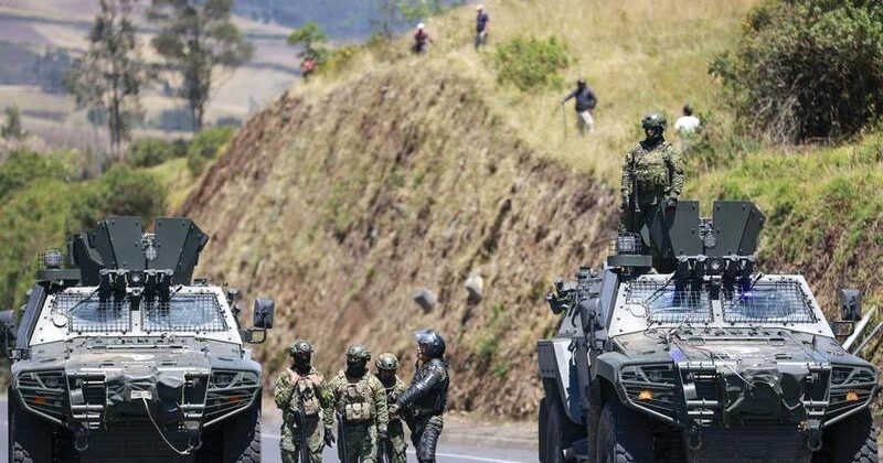 Elementos del Ejército de Ecuador vigilan un bloqueo realizado por indígenas durante el paro nacional indefinido en rechazo a la reciente eliminación del subsidio al diésel, en la provincia de Imbabura, en el norte de Ecuador, el 22 de septiembre de 2025. (Xinhua/Ricardo Landeta)