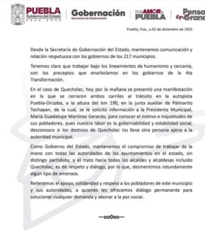 Desde la Secretaría de Gobernación del Estado de Puebla, mantenemos comunicación y relación respetuosa con los gobiernos...